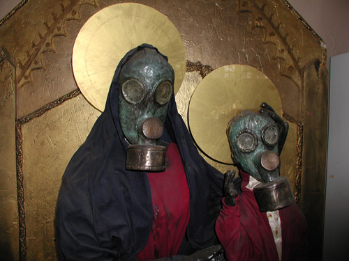 Mother and Child Enthroned in Magesty 2002 bronze, steel, fabric, wood
